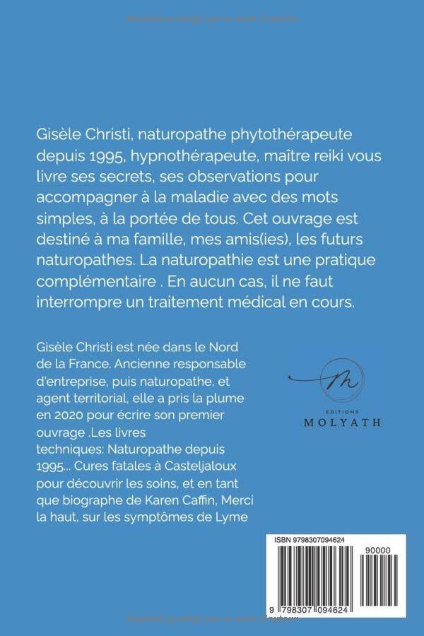Gisèle Christi vous livre ses secrets, ses observations pour accompagner à la maladie avec des mots simples, à la portée de tous. Il traite de la partie alimentaire, de l'intestin, de l'utilisation des huiles essentielles, de la phytothérapie, des macérats glycérinés. Cet ouvrage est destiné à ma famille, mes amis(ies), les futures naturopathes. La naturopathie est une pratique complémentaire . En aucun cas, il ne faut interrompre un traitement médical en cours.